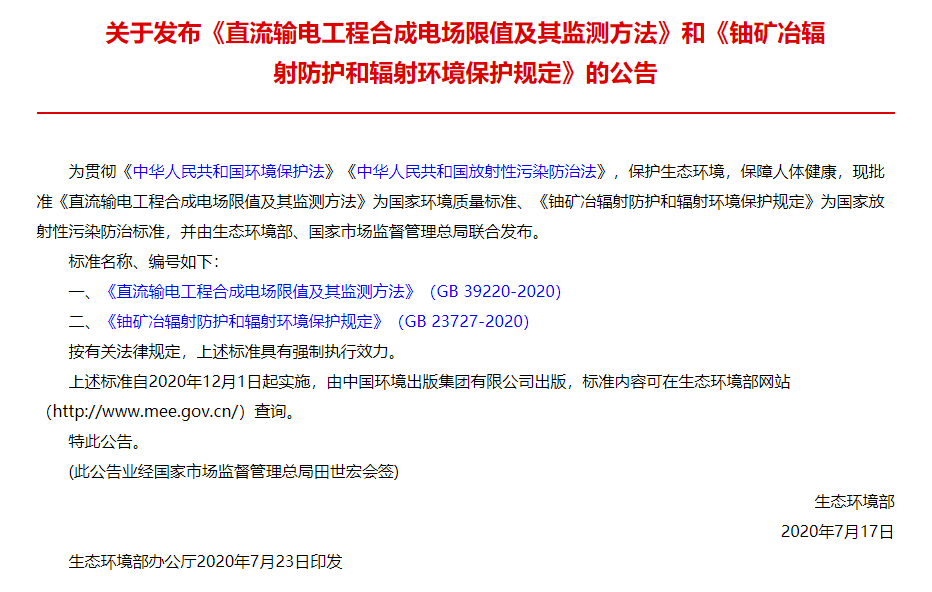 2020年7月23日,国家核安全局发布《直流输电工程合成电场限值及其监测方法》和《铀矿冶辐射防护和辐射环境保护规定》等两项标准。