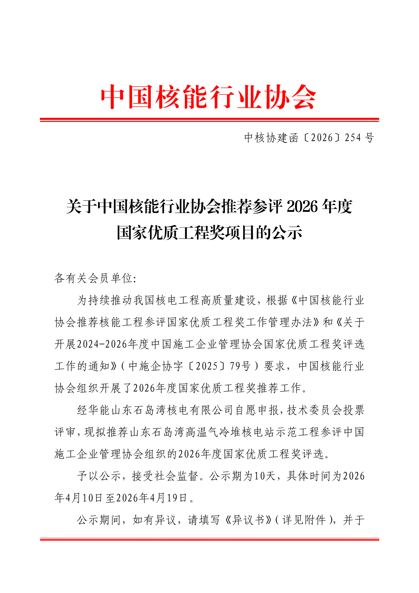 关于中国核能行业协会推荐参评2026年度国家优质工程奖项目的公示