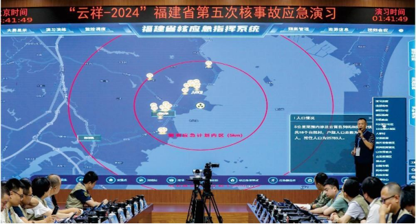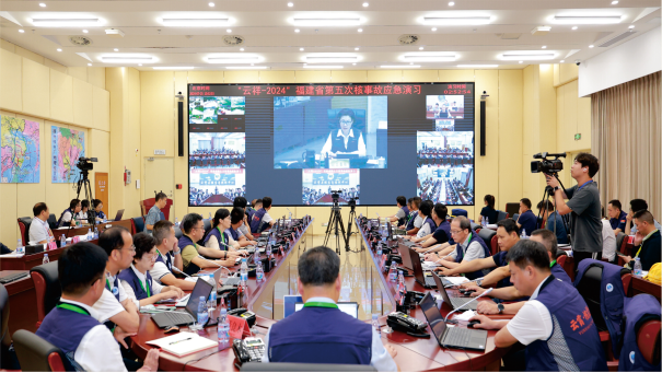 2024年7月25日,“云祥-2024”福建省第五次核事故应急演习暨漳州核电厂1号机组首次装料前核应急场内外联合演习正式进行,福建省核应急委员会、漳州市、云霄县、漳州核电三级四地联动,国家核应急救援力量(空中辐射监测、辐射防护技术支持)和驻地武警、防化部队现场参演,共1200余人参加,动用各类车辆装备100余台(套),分别在福州、漳州、云霄、核电厂4个指挥中心、1个现场指挥所、39个演习现场同步展开。演习过程中组织指挥、会商研判、去污洗消、撤离行动、应急安置、医疗救护、辐射监测……各项动作高标准完成,达到预期目的,圆满完成演习任务,得到国家评估团的充分肯定和高度赞扬。