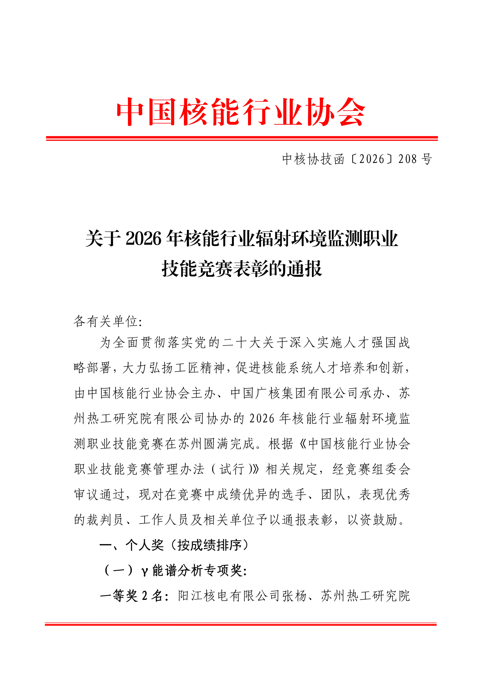 关于2026年核能行业辐射环境监测职业技能竞赛表彰的通报